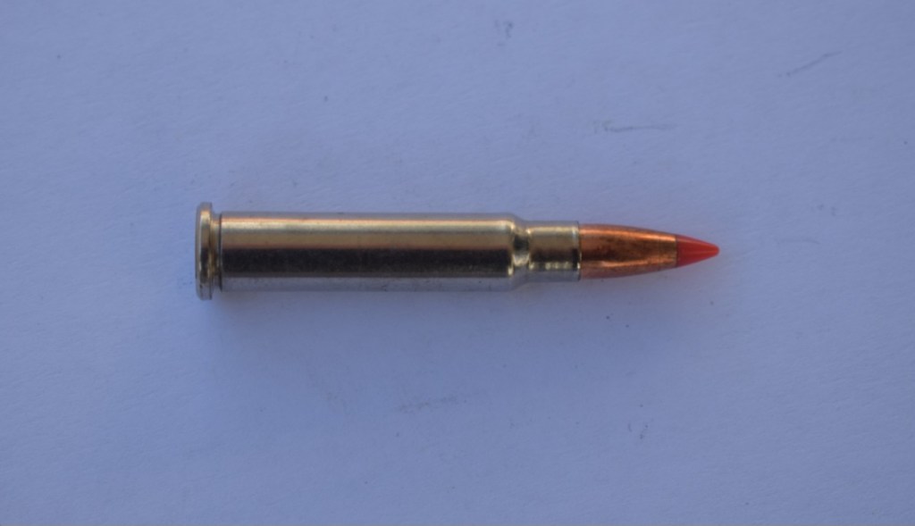 Комерсиалните боеприпаси са заредени с 8,5 грейна барут Accurate 1680 и 20-грамов куршум с кух връх.